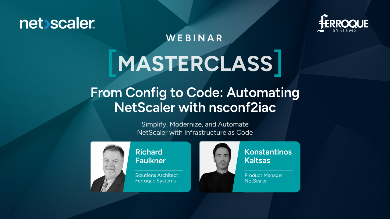 In this webinar, you’ll hear from Konstantinos Kaltsas, NetScaler Product Manager, who will introduce NSCONF2IAC and explain its role in the NetScaler ecosystem. Then, Richard Faulkner of Ferroque Systems will deliver a live demo showing how to migrate a real ns.conf file into Terraform and Ansible workflows.