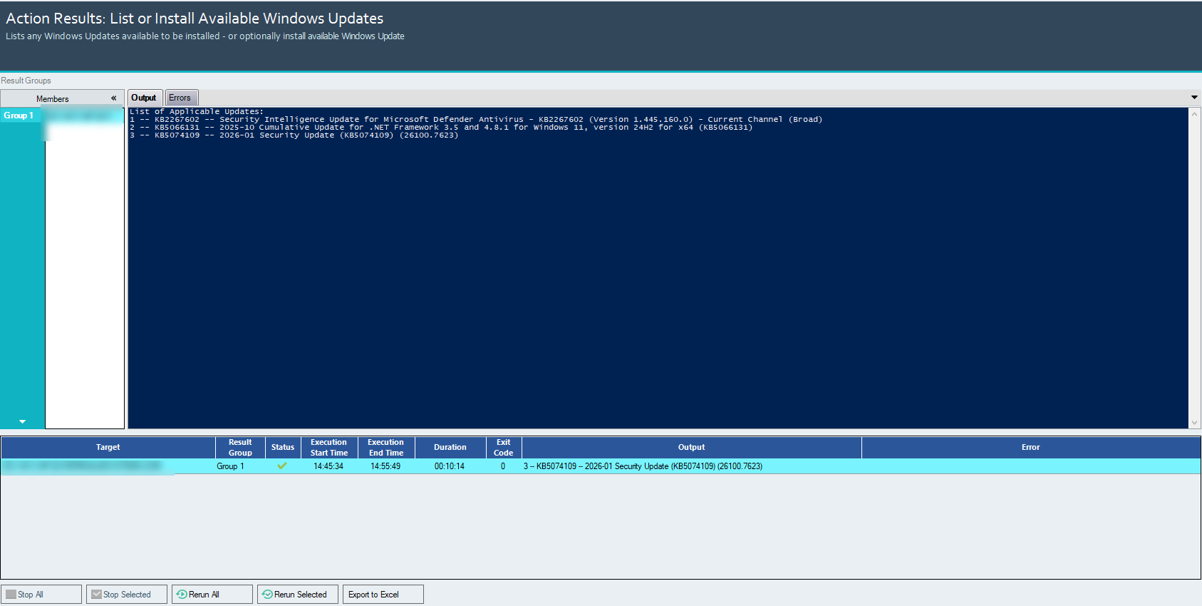 - The PowerShell execution window will display the output, showing the list of applicable pending Windows updates for the selected machine. The results typically include update details such as the update title, KB number, and installation status.
