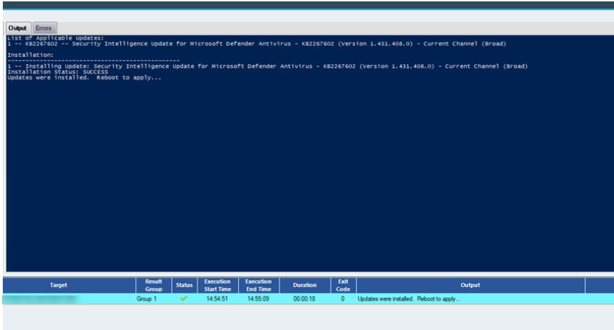 - Select the script to initiate the update scan. The script will query the Windows Update service on the selected machine and return a list of all pending updates, including relevant details such as update title, KB number, and reboot requirements (if applicable).