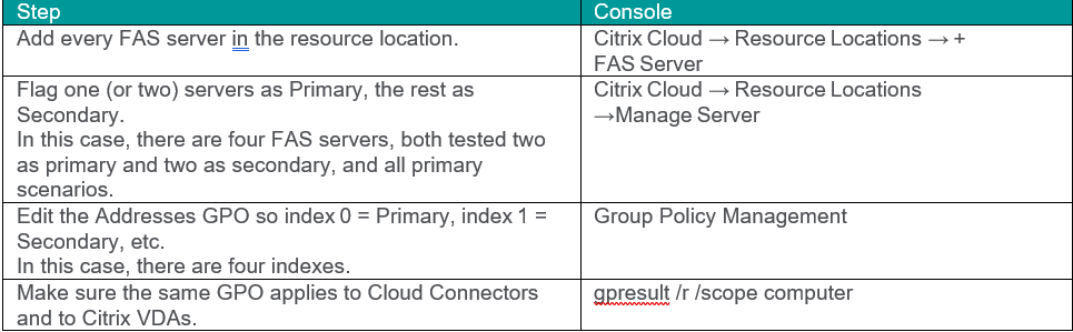 In Citrix Cloud, the Cloud Connector is used in lieu of StoreFront as the ticket issuer. When multiple Citrix FAS servers reside in a resource location, each server may be marked Primary or Secondary – through personal testing, if both servers are set as Primary, it does not relate to these 104 errors, and Citrix FAS works as intended. Because the Cloud Connector records the index of whichever FQDN it picks, the Address table on Cloud Connectors and VDAs must be in the same order as the Primary/Secondary list in the Citrix Cloud admin console.