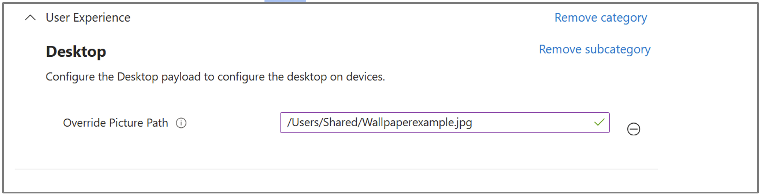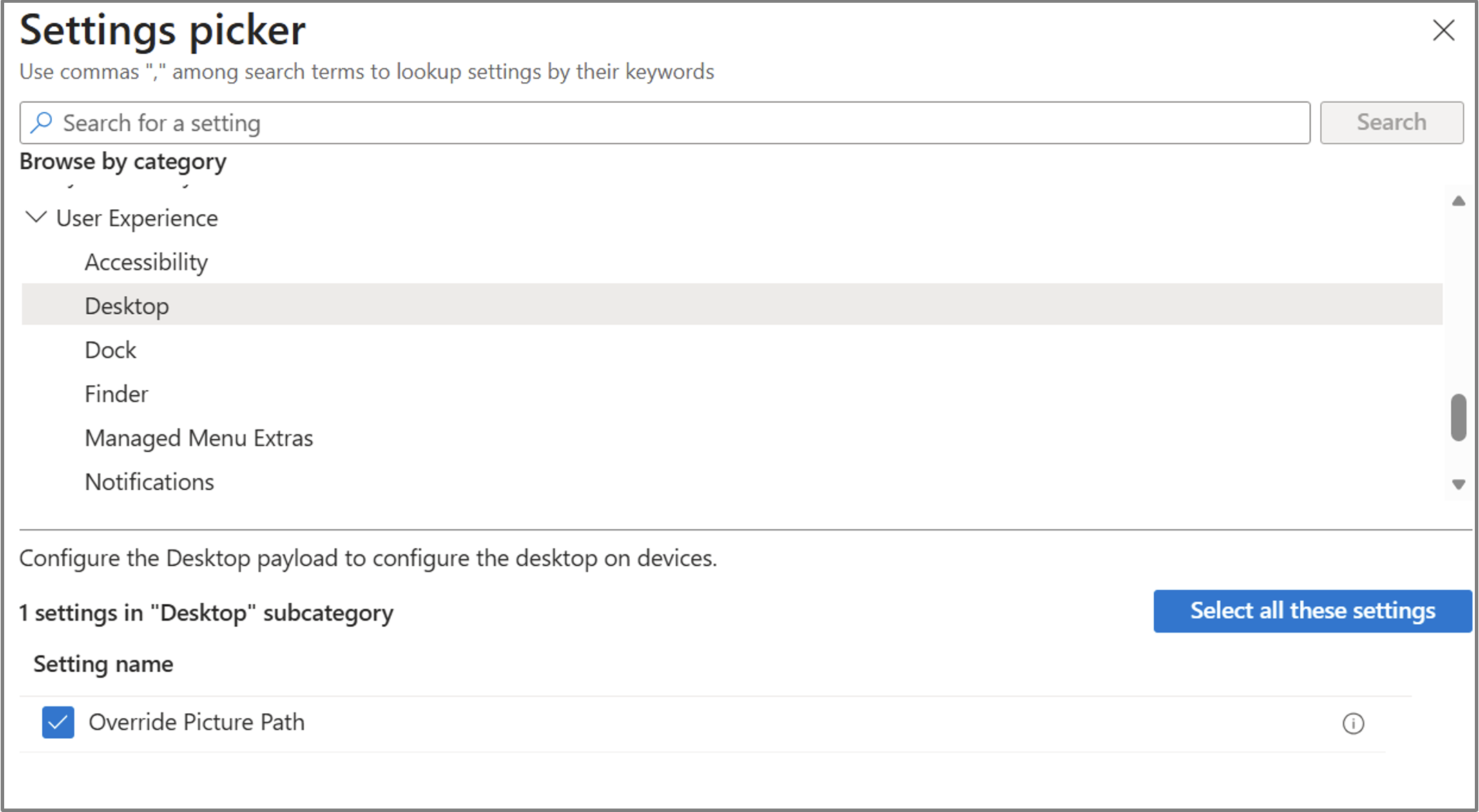 - Click on Add settings, and in the settings picker, go to User Experience > Desktop > Check Override Picture path.
