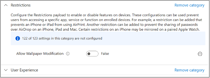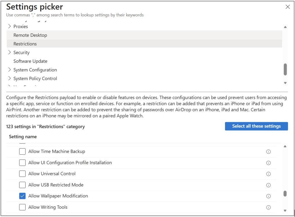 - Click on Add settings, and in the settings picker, go to User Restrictions > Allow Wallpaper Modification
