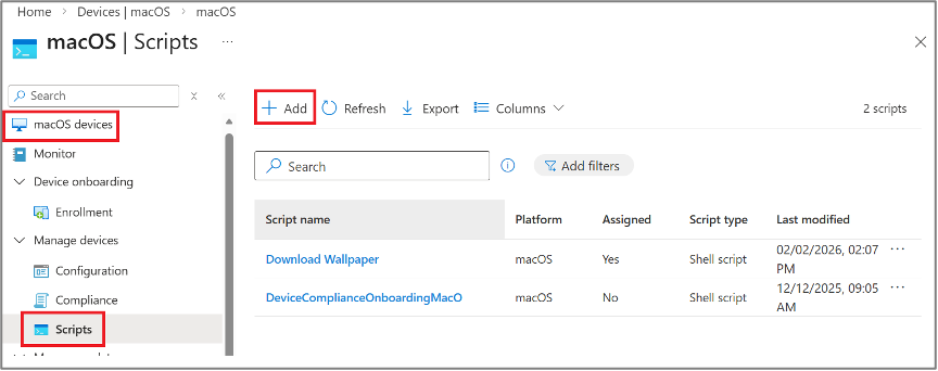 - In the Intune portal, go to Devices > By platform > macOS > Manage devices > Scripts > Add.