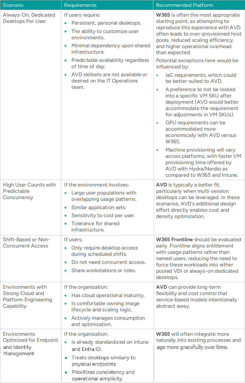 By this point, the distinction between AVD and W365 should be clear: rather than competing models, they are delivery models optimized for different outcomes. The remaining challenge is turning that understanding into practical decisions that can be applied consistently.