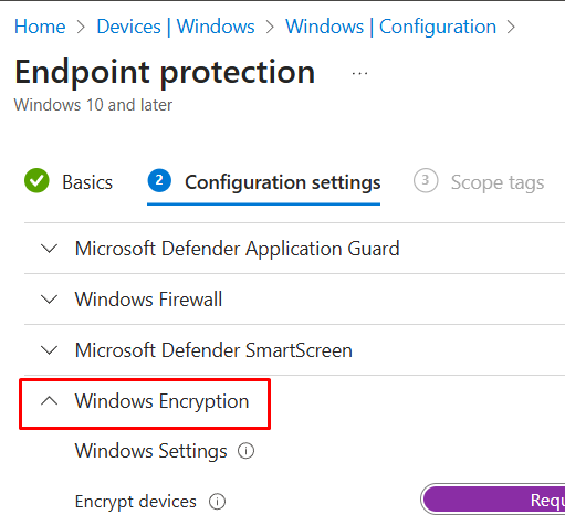 - On the Configuration settings tab, expand the section Windows Encryption. All configuration options are under this section.